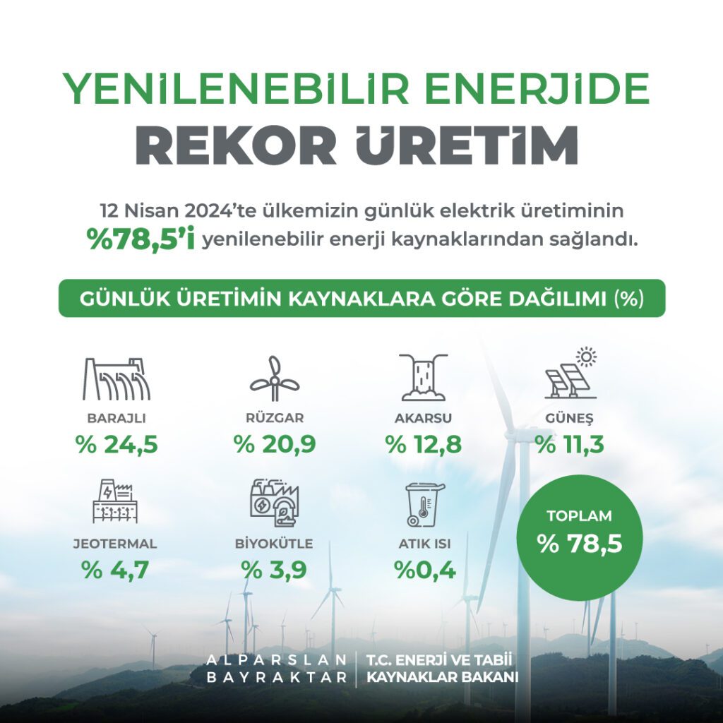 Türkiye, bayramın üçüncü günü elektrik üretiminde yeni bir rekor kırdı. Enerji ve Tabii Kaynaklar Bakanı Alparslan Bayraktar, “12 Nisan’da günlük elektrik üretiminin yüzde 78,5’ini yenilebilir kaynaklardan sağladık” dedi. Bakan Bayraktar, yenilenebilir enerjinin Türkiye’nin cari açık ve iklim değişikliğiyle mücadelesinde kilit rol üstlendiğinin altını çizdi.