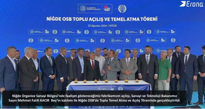 Erona Enerji‘nin Niğde Organize Sanayi Bölgesi’ndeki yeni fabrikası, Sanayi ve Teknoloji Bakanı Mehmet Fatih Kacır’ın katılımıyla gerçekleştirilen toplu temel atma ve açılış töreniyle kapılarını açtı. Törende, 5,1 milyar liralık yatırımla 15 tesis hizmete girdi. Aynı zamanda, 15,1 milyar liralık bir yatırım hedefiyle 11 tesisin temeli atıldı.