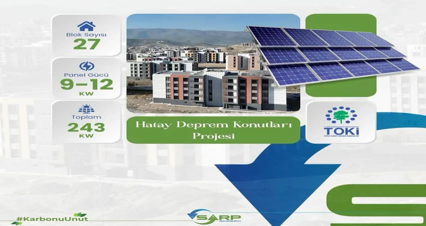 TOKİ’nin Hatay’da yürüttüğü konut projeleri kapsamında geliştirilen çalışmaya göre, Sarp Enerji toplam 27 blokta güneş enerjisi sistemleri kuracak. Her bir blokta ortalama 9 ile 12 kW arasında değişen güce sahip GES kurulumu planlandı. Projenin toplam kurulu gücü 243 kW olarak belirlendi.